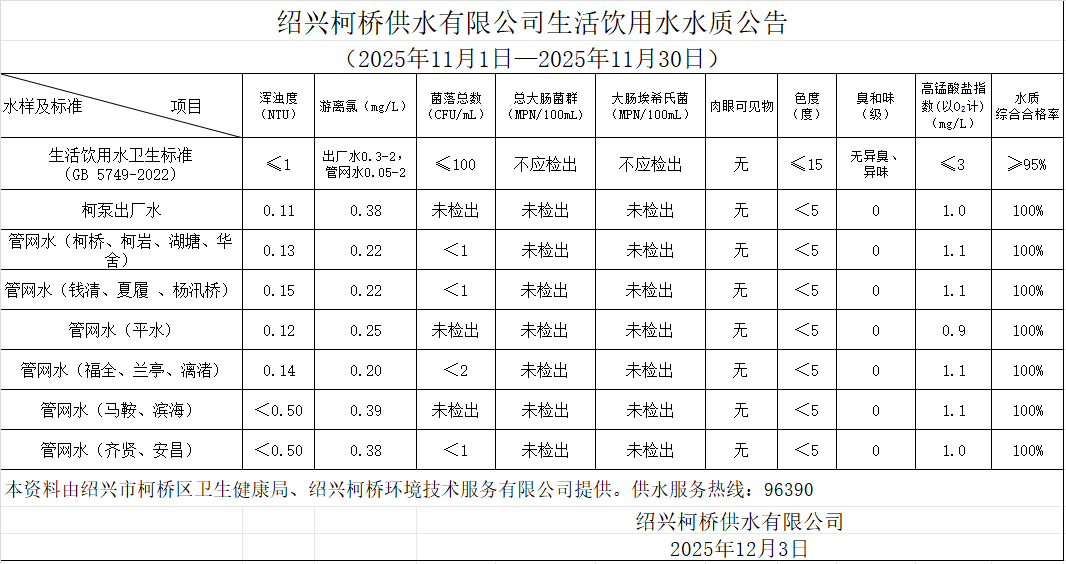 生活飲用水水質(zhì)公告(2025年11月1日—2025年11月30日)